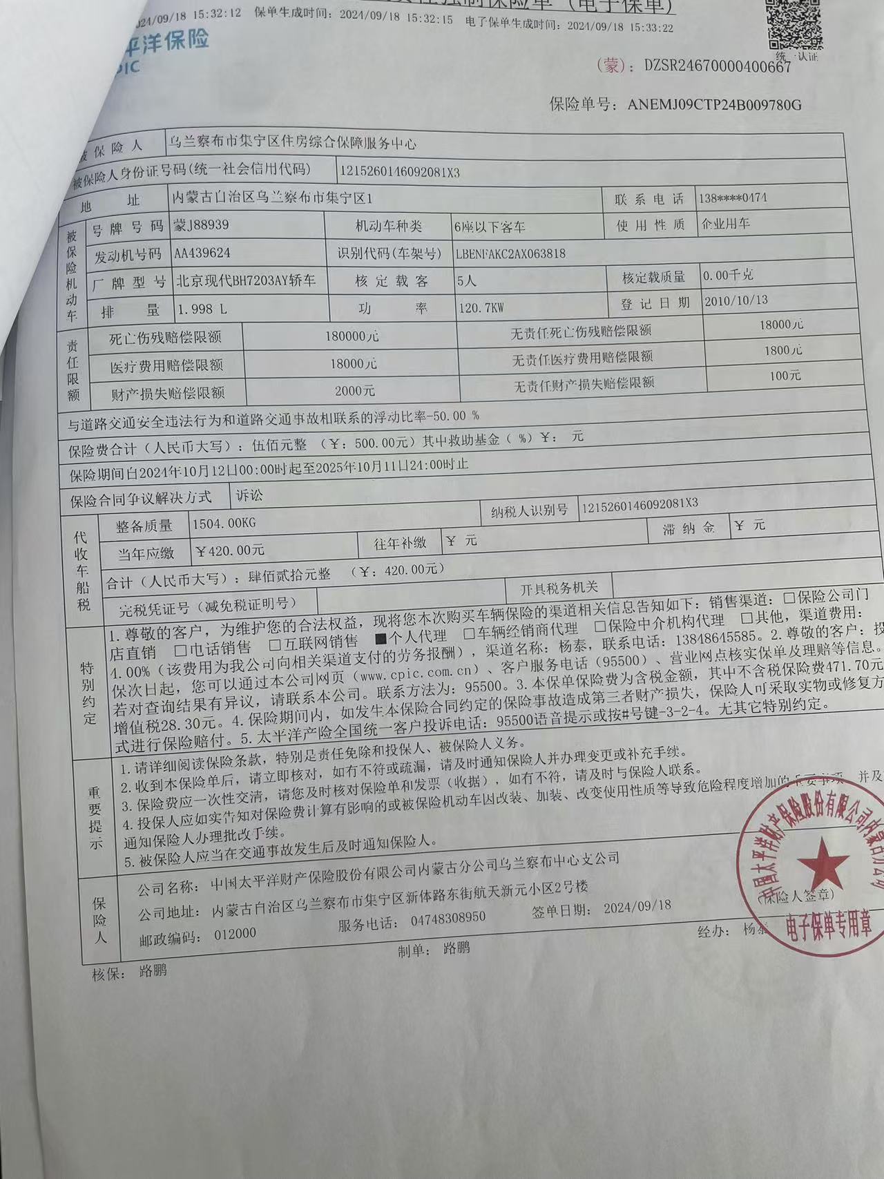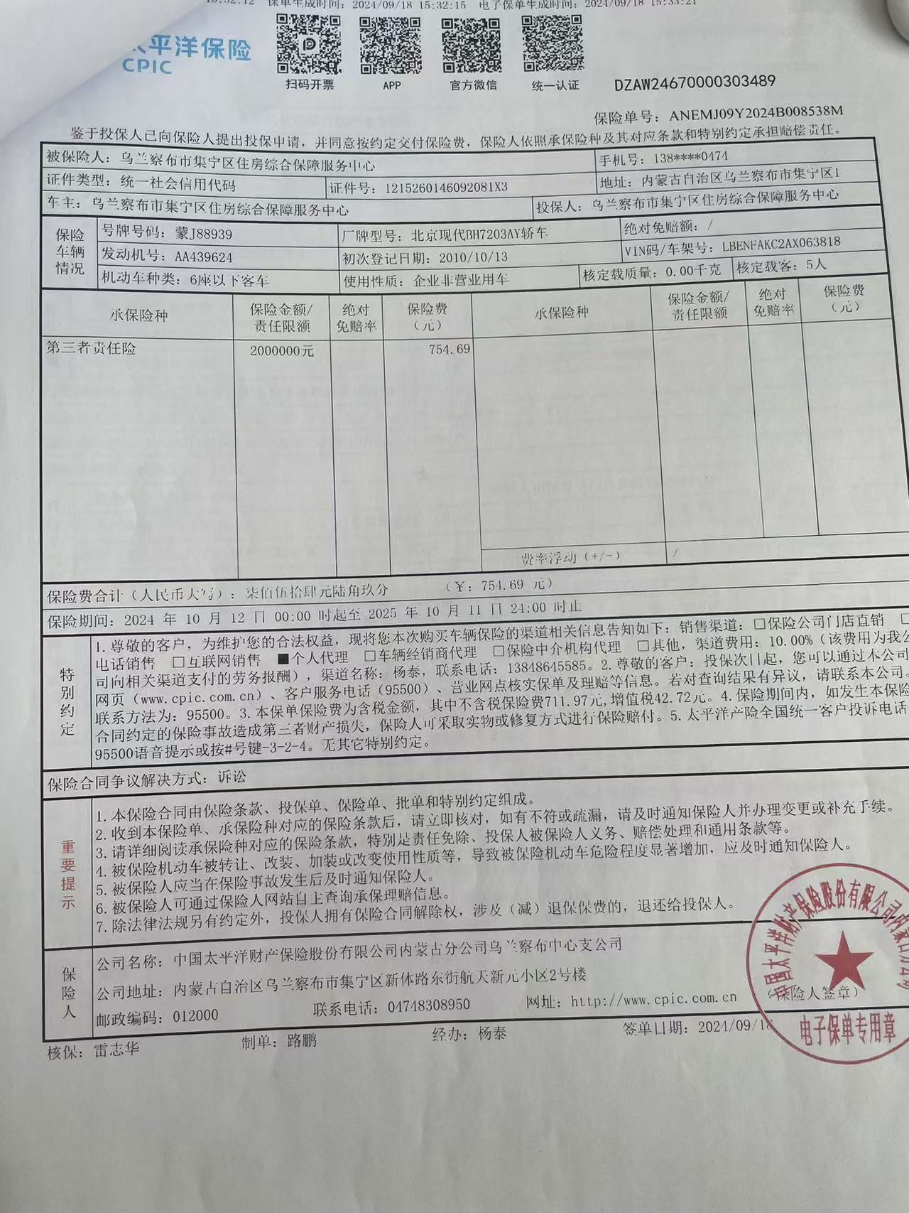 | 1 | 车辆保险 | 1(辆) | ¥1,674.69 | ¥1,674.69 | 蒙J88939车辆保险 |